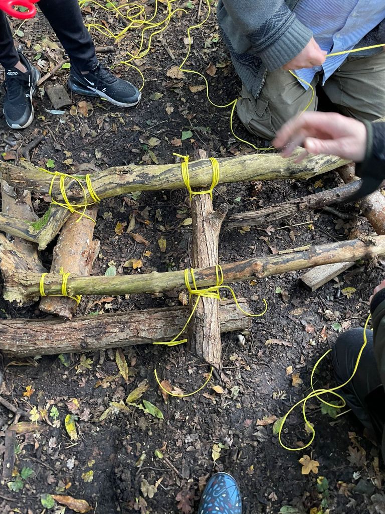 Preparing a game of noughts & crosses using sticks and rope.Noughts & crossesSticks for whittlingDecorating a denBuilding shelterHow much wood do we need for cooking on fire?Autumnal leavesRoasting pineappleForest school leader Level 3 program by FSLI